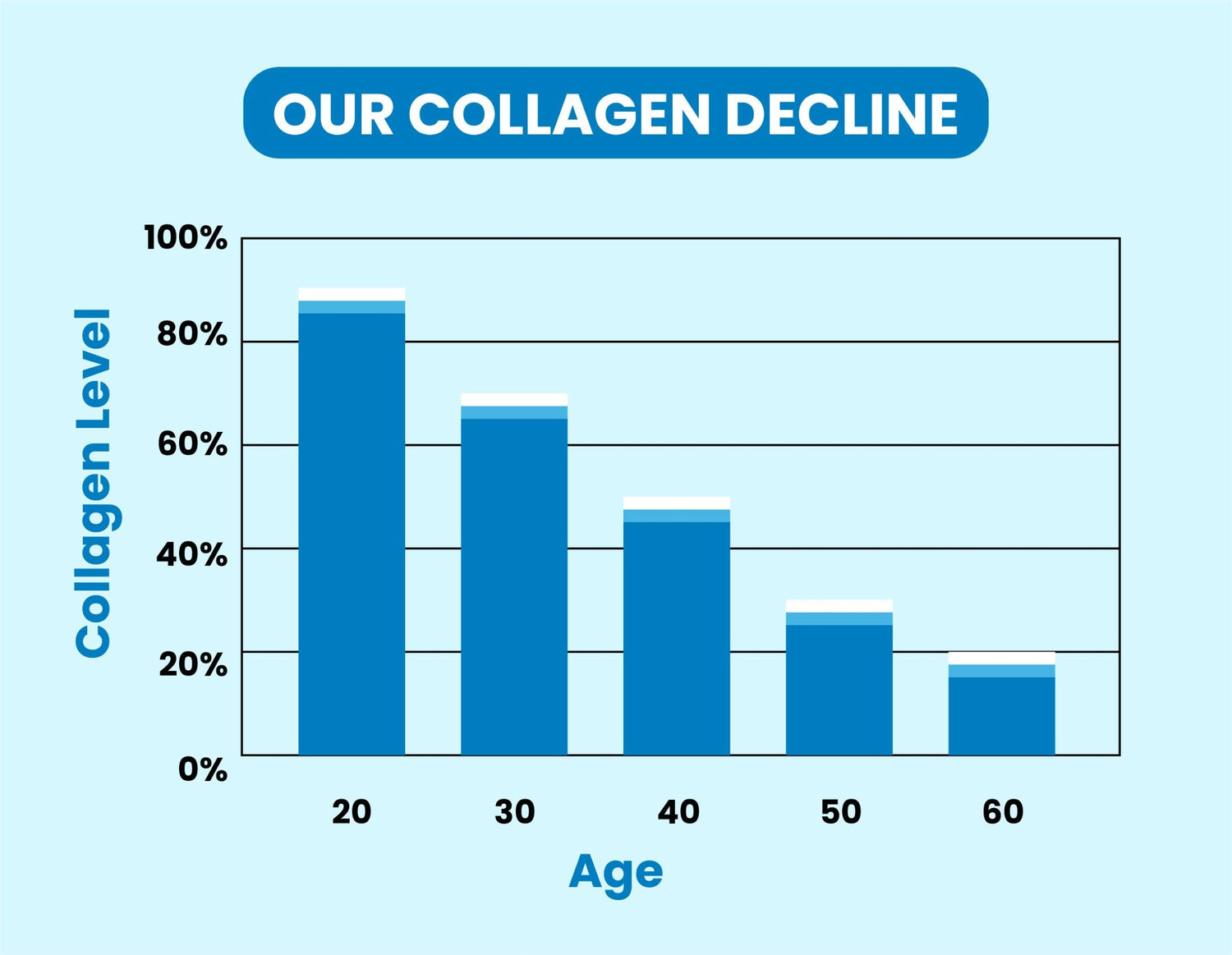 When we’re young, our bodies are naturally high in collagen, but as we age past 20, our collagen levels decrease significantly. This drop in collagen is what causes dull, sagging & dehydrated skin that’s prone to wrinkles & fine lines, as well as thinning hair, weaker joints & brittle nails.